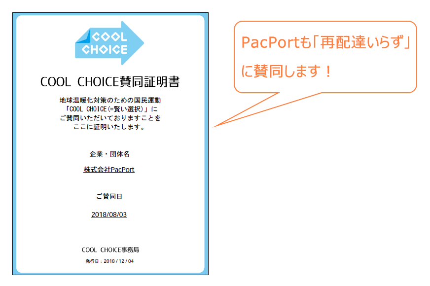 このたび株式会社 PacPort(本社:東京都中央区 代表取締役社長:沈 燁、以下当社)は、環境省主催・地球温暖化対策のための国民運動「COOL CHOICE(=賢い選択)」の賛同企業として承認されましたのでここにお知らせします(https://ondankataisaku.env.go.jp/coolchoice/butsuryu/)。