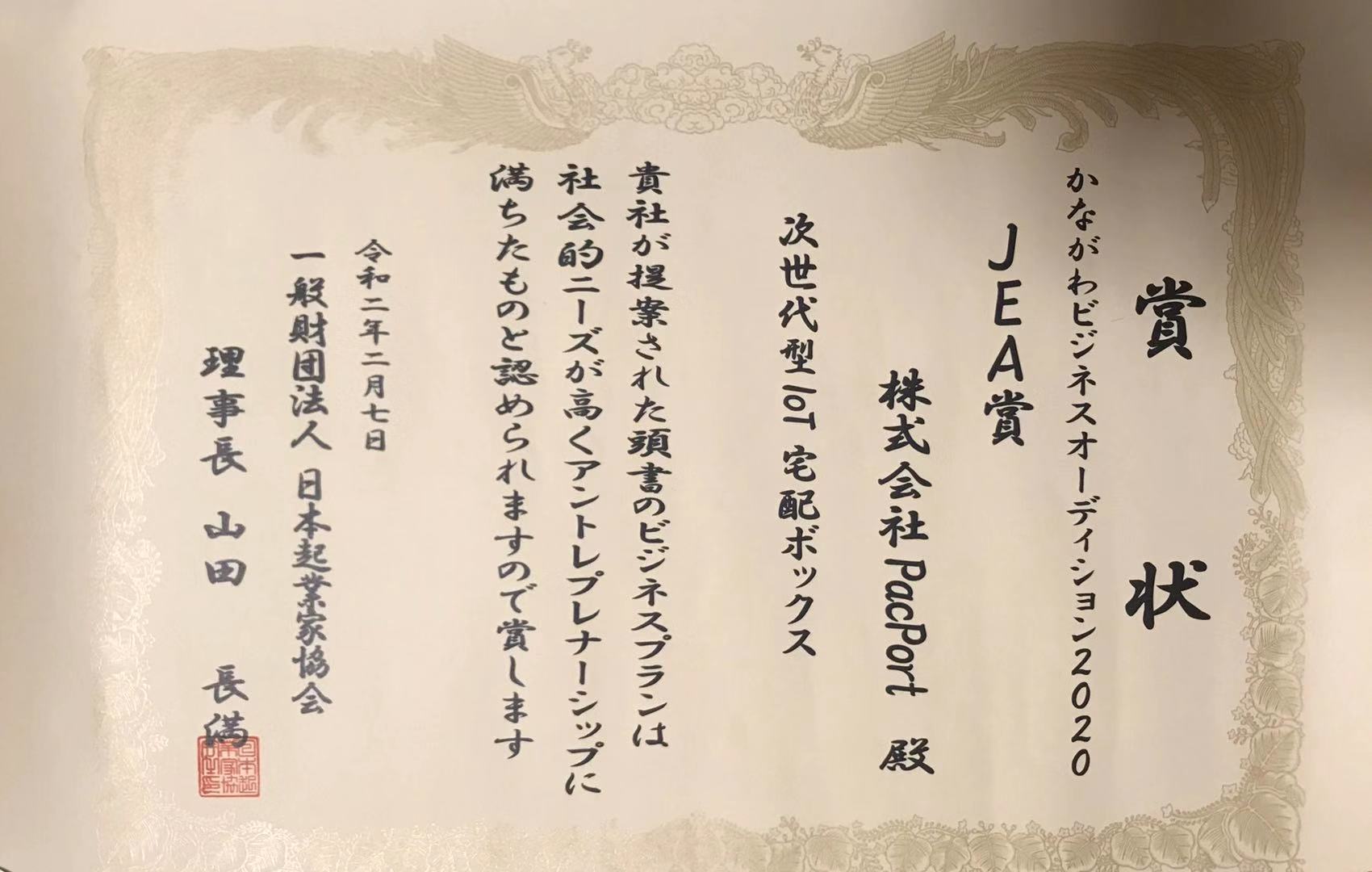 『かながわビジネスオーディション 2020』は、「新たに取り組もうとする事業に関するビジネスプランを募集・評価し、優秀なものについて発表の機会、ビジネスパートナーとの出会いの場を提供すること」を目的に、2 月 7 日にパシフィコ横浜アネックスホール(横浜市西区みなとみらい)で開催されました。当日、神奈川県を含む8つの団体から構成されたかながわビジネスオーディション実行委員会が、応募総数 100 件の中からファイナリストに入選した 10 社を発表しました。当社がエントリーした『次世代型 IoT 宅配ボックス』は「サービス業で市場性のある魅力的なもの」として高く評価され、このほど「JEA 賞」にあたる「日本起業家協会賞」に選ばれました。