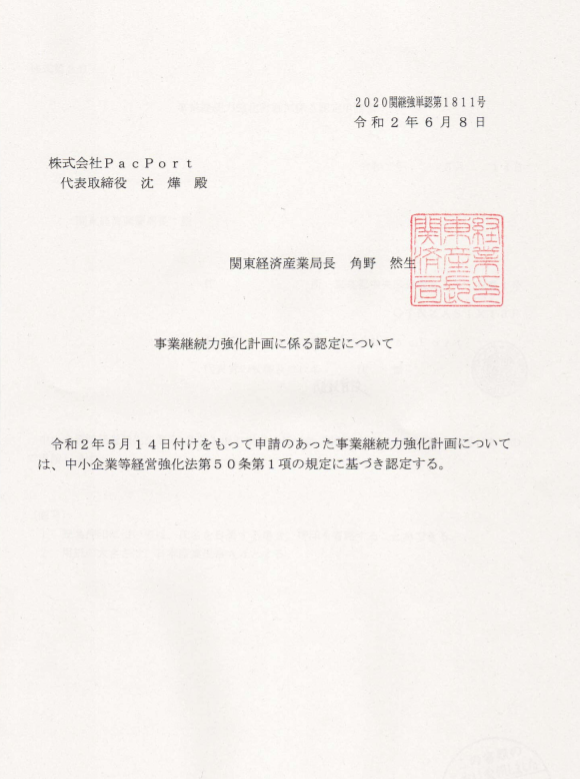 この度、弊社の「事業継続力強化計画」が経済産業省関東経済産業局に認定されたことをお知らせいたします。これにより、弊社は今後、自然災害等のリスク認識や事業活動に与える影響を踏まえて、同局の支援の下で事業継続力の強化に一層取り組んでまいる所存です。