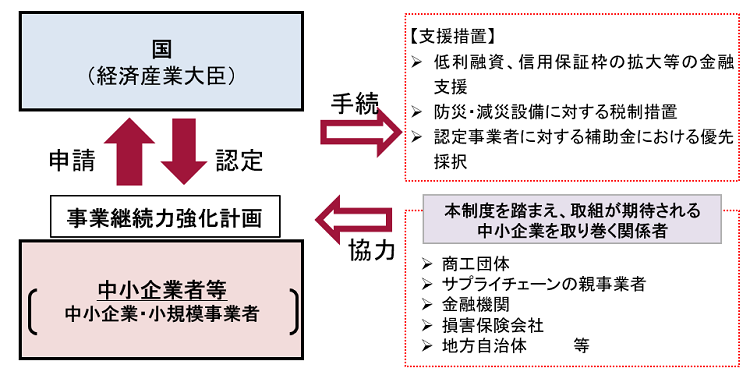 「事業継続力強化計画」とは、中小企業が自然災害等による事業活動への影響を軽減することを目指し、事業活動の継続に向けた取組を計画するものです。経済産業大臣から計画の認定を受けた中小企業は、防災・減災設備に対する税制優遇、低利融資、補助金(ものづくり補助金等)の審査上の加点等の支援を受けることができます。