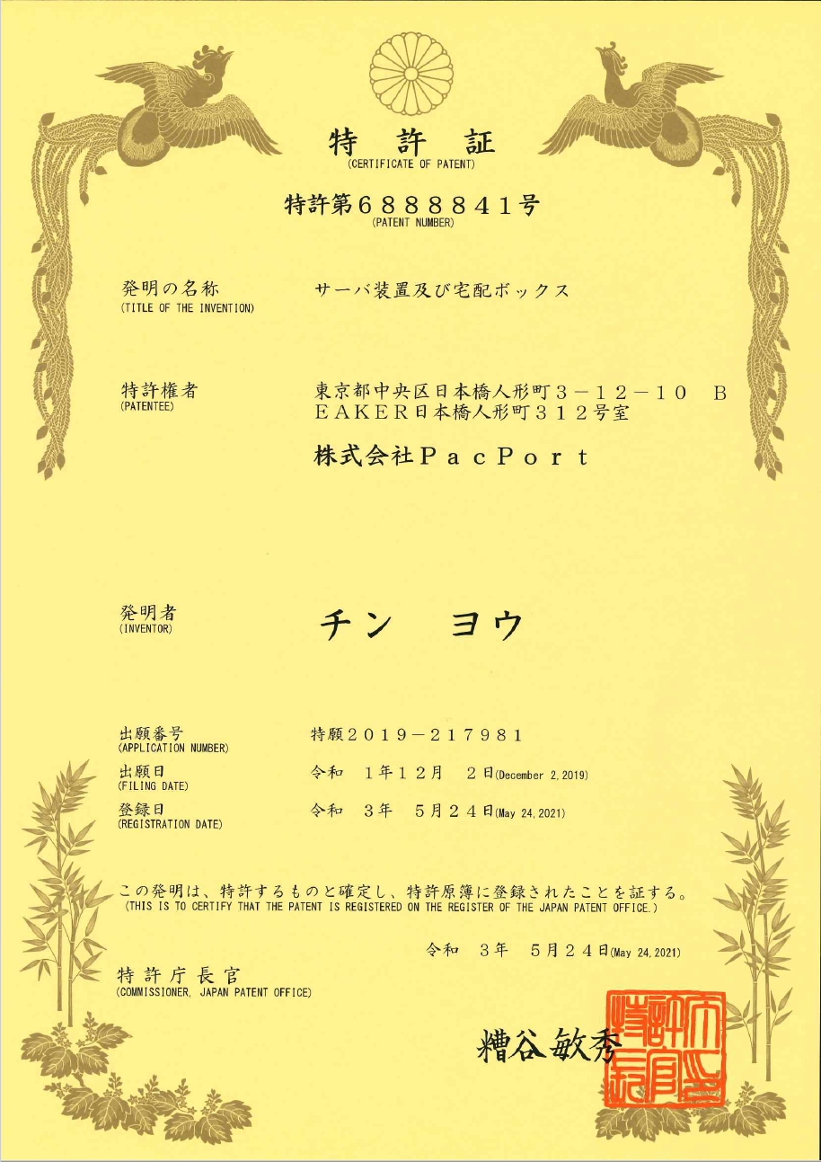このたび、当社が出願しておりました【サーバ装置及び宅配ボックス】(お問い合わせ番号+電話番号で荷受人特定)について、以下のとおり特許を取得したことをお知らせいたします。