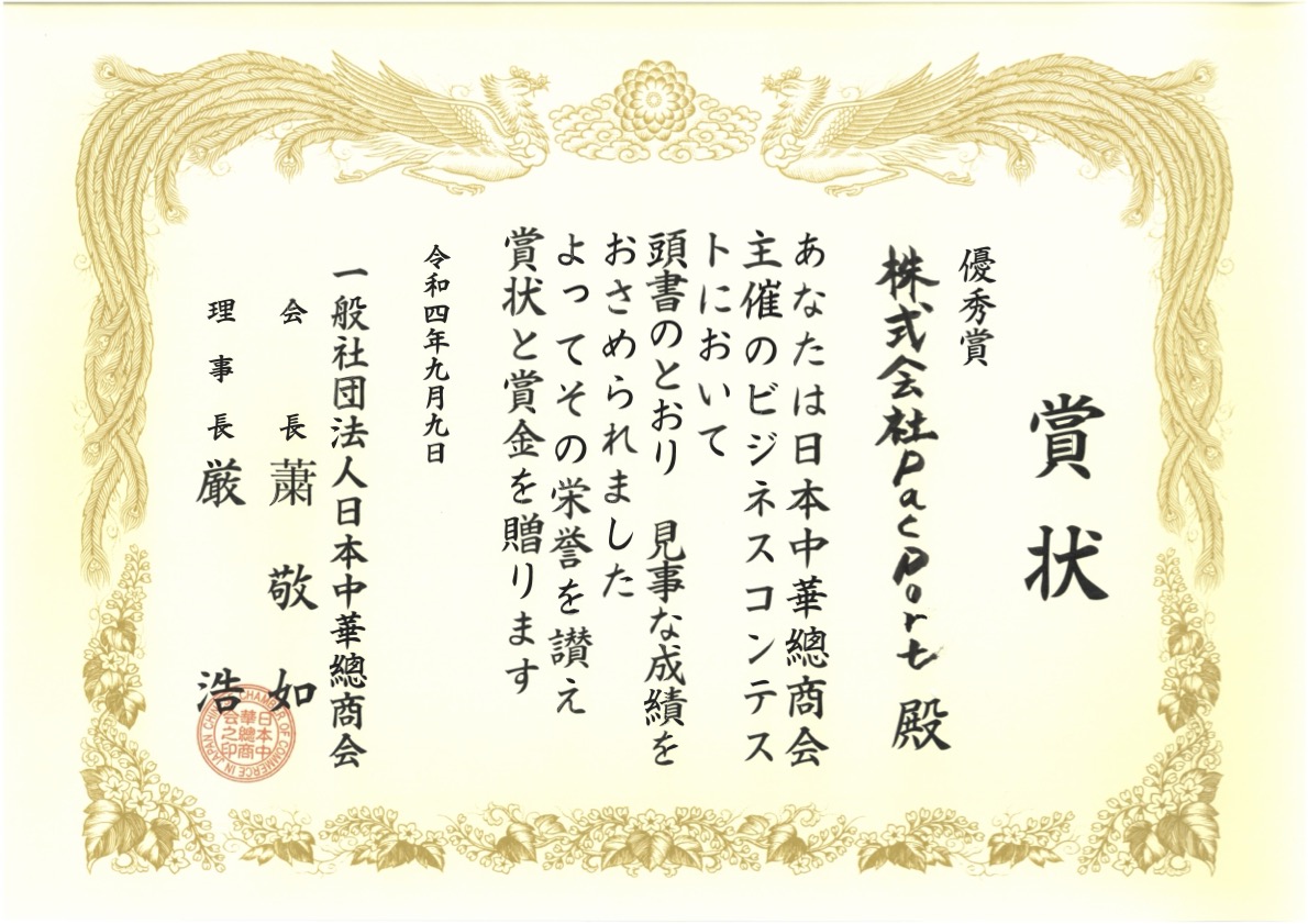在日華僑・華人の最大の経済団体である一般社団法人日本中華總商会(CCCJ)が、日本発の優れたスタートアップを発掘する目的で開催した「日本中華總商会ビジネスコンテスト 2022」で、約 30 社の参加企業の中から PacPort が優秀賞に選ばれました。